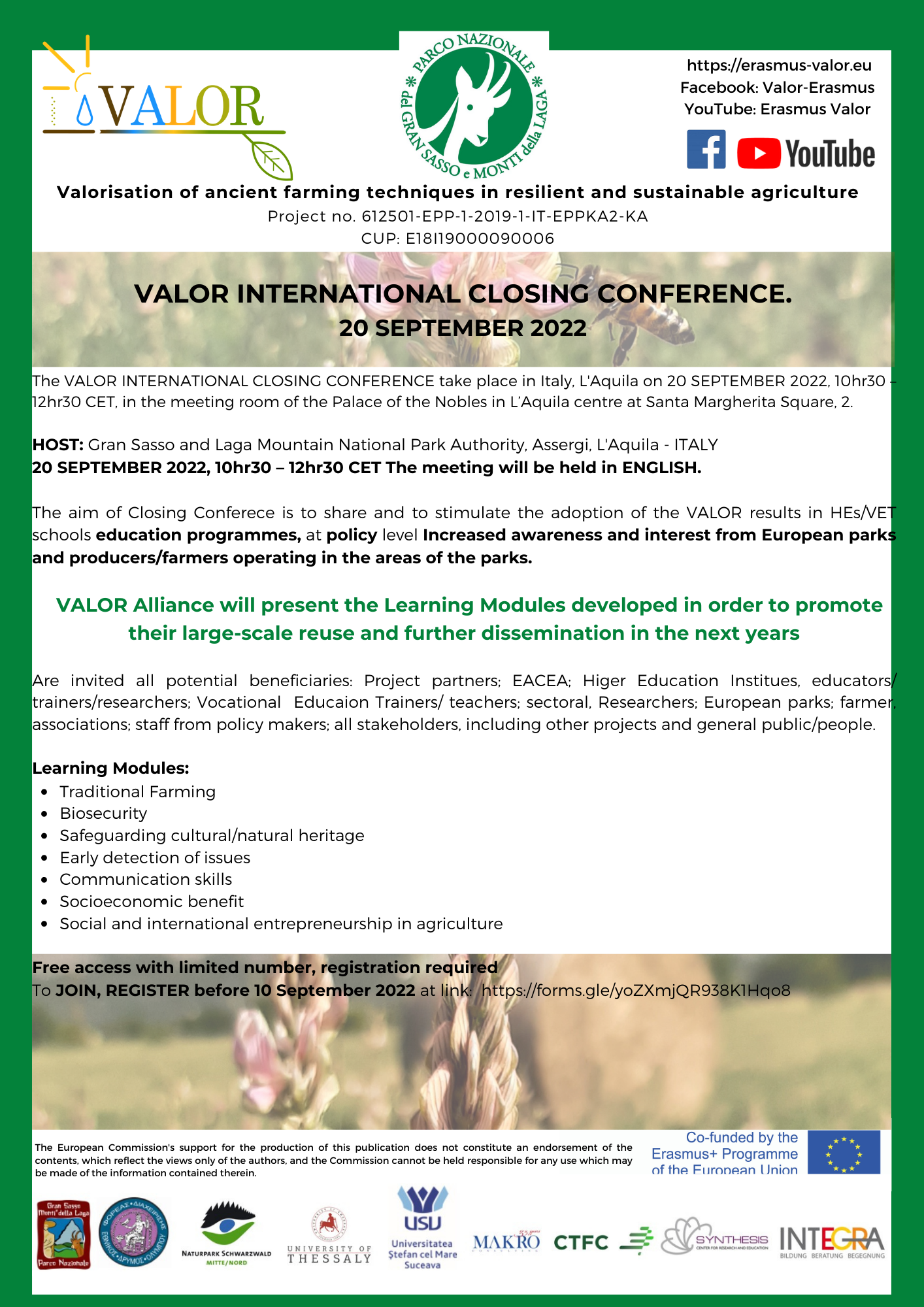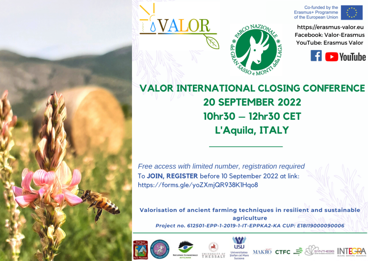 The Closing Conference of the VALOR project will be held on September 20 in L’Aquila, Italy, and is aimed at the public and private training community; educators/trainers/researchers; vocational education trainers/teachers; sectoral researchers; European parks; farmers; associations; policy makers’ staff; all stakeholders and the general public.